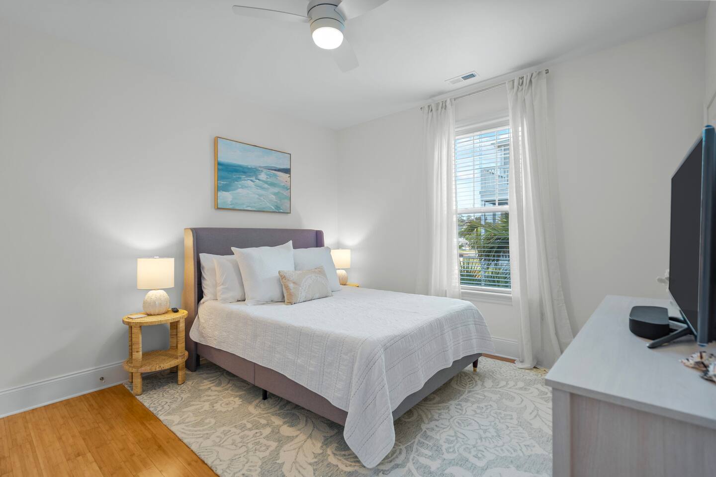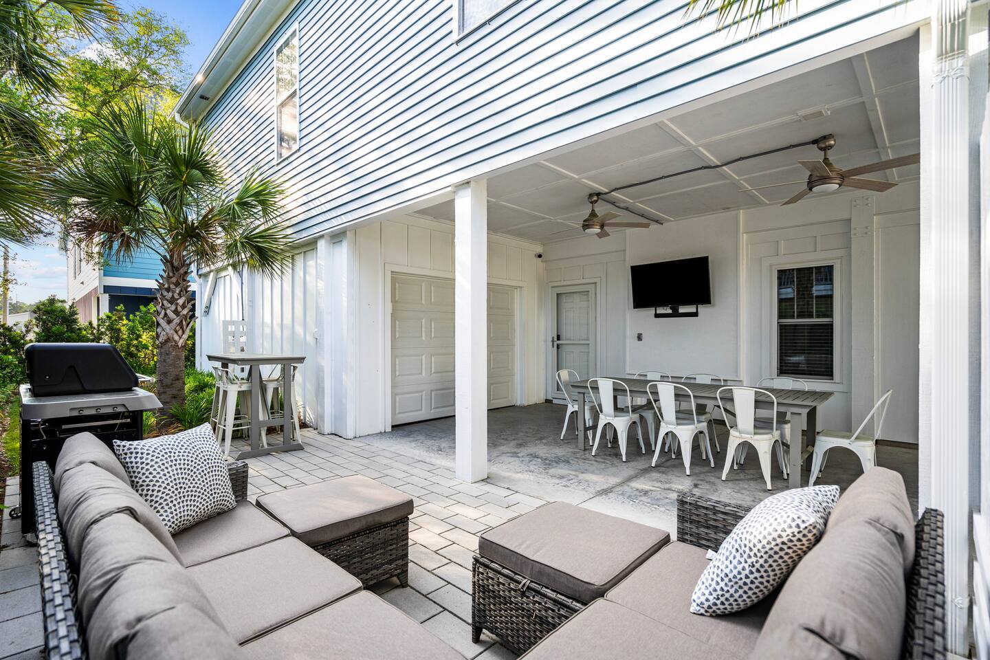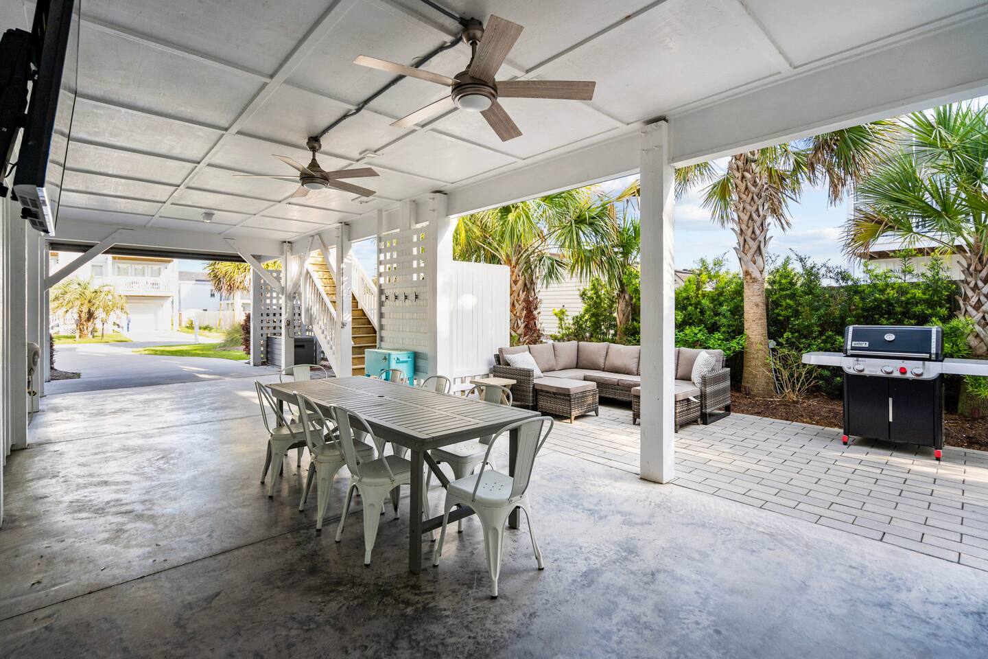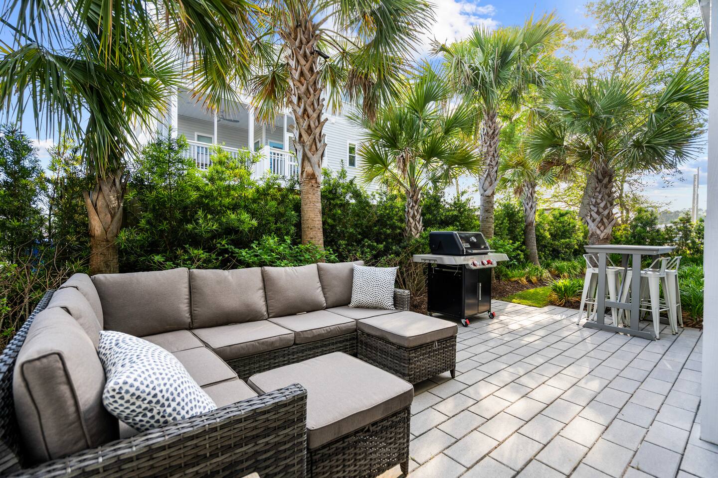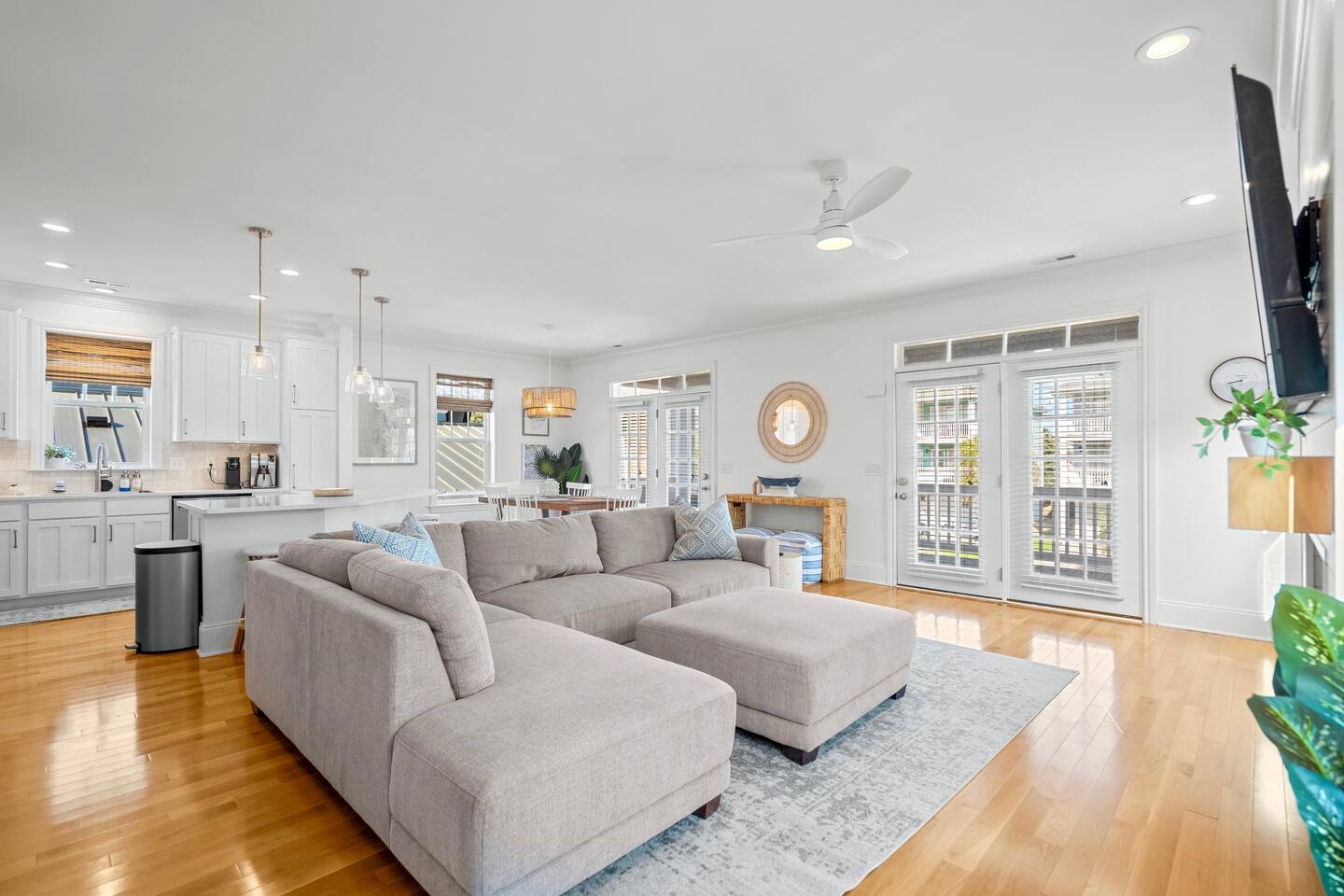 Welcome to The Blue Palm – Your Carolina Beach Retreat! Step into our newly renovated coastal haven, designed for relaxation and fun. The main living area features a plush sofa, large Smart TV, and sun-filled windows that create a bright, airy atmosphere. Cook with ease in the fully equipped kitchen, then step out to the private patio for breezy mornings or unwind with outdoor dining and a BBQ at the covered table. We’ve stocked the home with beach chairs, toys, towels, and a wagon so you can travel light and hit the sand stress-free. Sleeping arrangements are perfect for families and groups: Master suite with king bed + en-suite bathroom Two queen bedrooms with Smart TVs Custom queen bunkroom with its own lounge and Smart TV With three full bathrooms, memory foam mattresses, crisp linens, and a washer/dryer, comfort is always guaranteed. Location highlights: 0.3 miles to Alabama Beach access (with public restrooms) 0.2 miles to Island Greenway Trail 1.5 miles to Kure Beach Pier 1.6 miles to Carolina Beach Boardwalk 1.7 miles to Carolina Beach State Park 4.3 miles to NC Aquarium at Fort Fisher Extra touches include: keyless entry, private parking for 4 cars, an outdoor shower, and stocked bath essentials. Whether you’re here to relax, explore, or make memories with loved ones, The Blue Palm offers the perfect balance of comfort, convenience, and coastal charm.